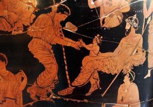 Tu expliques à partir des Bacchantes la chose suivante dans « le discours de Tirésias »: « Là-haut, l’épouse de Zeus, la divine Héra, jalouse du nouveau petit dieu – et pour cause, il est le symbole de la tromperie de son mari –, a voulu le jeter hors du ciel. Mais Zeus ne l’a pas laissé faire et a machiné contre elle un stratagème digne du dieu rusé qu’il est : il a arraché un morceau d’éther à l’enveloppe de la terre, et l’a donné en otage à Héra en lieu et place du petit Dionysos. Et c’est contre ce leurre, contre ce faux Dionysos, que la déesse a alors soulagé sa colère. Puis, avec le temps, les hommes, dont les oreilles ne sont pas toujours enclines à entendre les haut-faits et signes divins, ont rapproché les mots grecs « homèros, otage » et « mèros, cuisse ». Ils se sont mis à raconter que le petit Dionysos avait été cousu dans la cuisse de Zeus parce qu’il avait été donné en otage à la colère d’Héra. Rapprochement et récit confus, qui ont fini par obscurcir et discréditer ce qui s’était réellement passé. Au point que tout se mélange dans les mémoires. »
