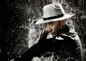Et nous voilà justement arrachés de tout ça, catapultés dans un univers tout différent : fini les couleurs mobiles, les charmes de l’indistinction et du mystère, les frôlements et transformations infimes et l’indéfinissables. Nous voilà dans une rue. Sous une pluie battante. Dans une cour fermée par une haute grille. Le contraste est violent, grandiose : malgré la nuit, tout sort désormais de l’ombre, comme en noir et blanc, d’une précision et netteté inouïe. On découvre un homme (Ip Man/Tony Leung), chapeau sur la tête, pieds dans l’eau, entouré de toute une série d’adversaires à la mine patibulaire ; puis on voit les gouttes tomber du ciel ; s’écraser sur le chapeau, ou alors gicler sur le sol gorgé d’eau ; tantôt à vitesse réelle, tantôt en hyper-ralenti. Nous sommes plongés dans le moment présent. Comme seul Wong Kar-Wai sait le faire.