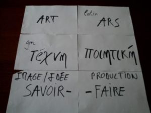 LE MOT « ART » VIENT DU LATIN ARS, traduction du grec technè, technè poiètikè qu’on traduit généralement par savoir-faire : prise en compte d’une certaine image ou idée (dont on a un savoir), en vue de sa production (faire) dans une certaine matérialité sensible.